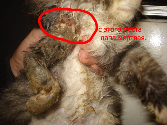 Раздроблена подушечка лапки, заражение пошло вверх. Лапа отмирает. Боль адская. Гной даже капает.