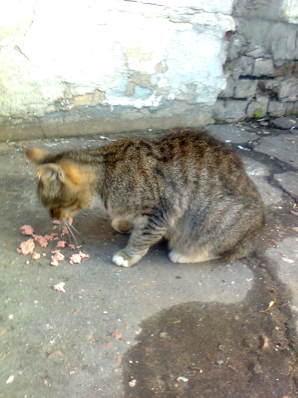 кошка обрела большую популярность! уже мои коллеги ее кормят. ходят кушать туда в столовую и выносят ей поесть! вчера у нее был настоящий пир!!!