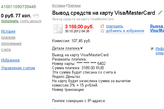после комиссии (за перевод с ЯК на карту - 107,45). Сумма к получению 3081,55