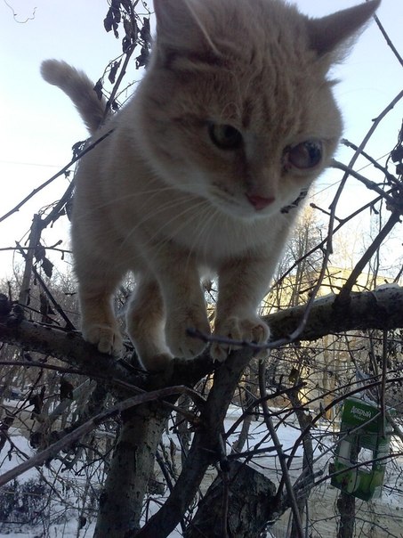 Травматическое или инфекционное поражение глаза. Его подкармливают жители дома,во дворе которого он живет.Но взять его на лечение никто не хочет.