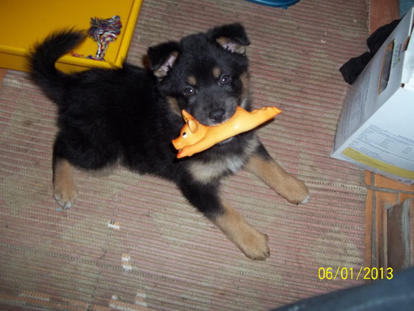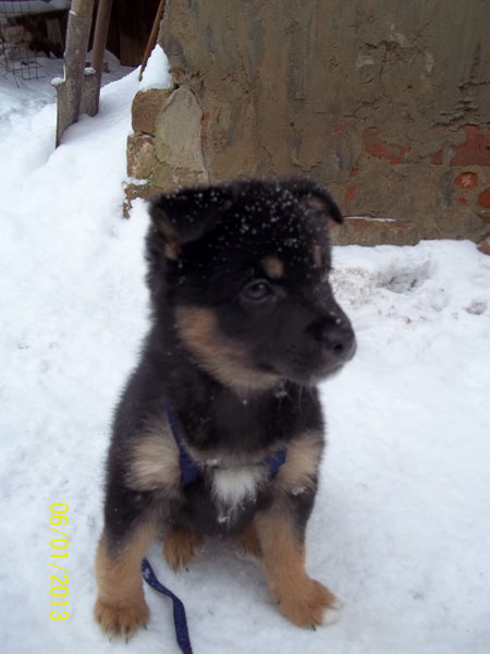 Щенок-девочка, возраст 1,5 месяца, будет не крупной собакой. Очень сообразительная, легко поддается дрессировке.
