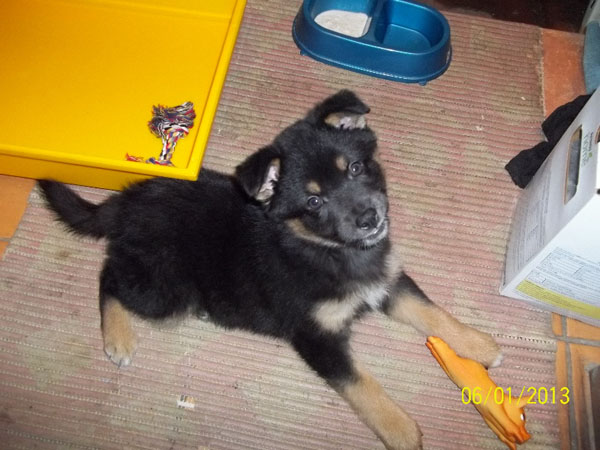 Щенок-девочка, возраст 1,5 месяца, будет не крупной собакой. Очень сообразительная, легко поддается дрессировке.