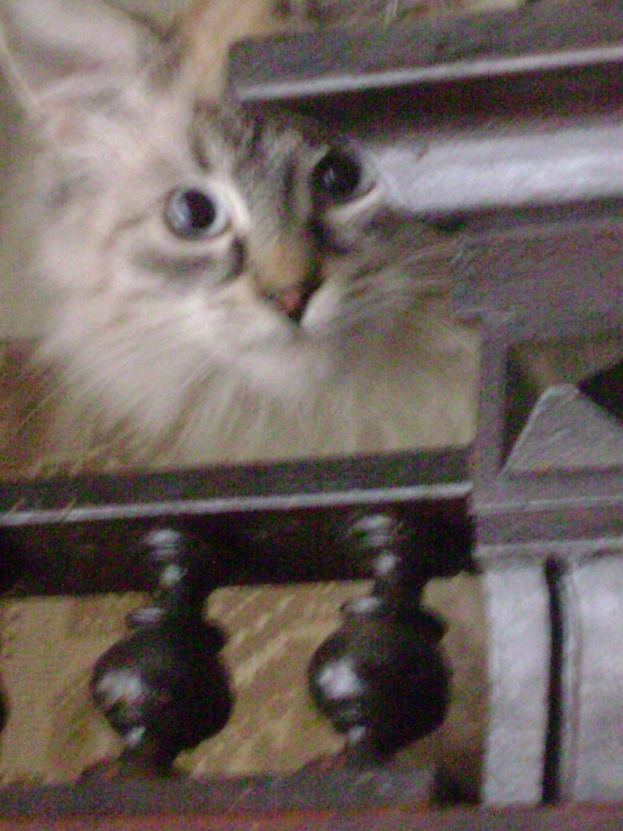 Еще с дачи у Ларисы Николаевны живут дома 2 котенка месяцев 4-5. Сфотографироать удалось только одного, сказали что мальчик. Второй полосатик, нас увидел спрятался. Их бы на передержку, адаптировать, дома у ЛН три собаки.