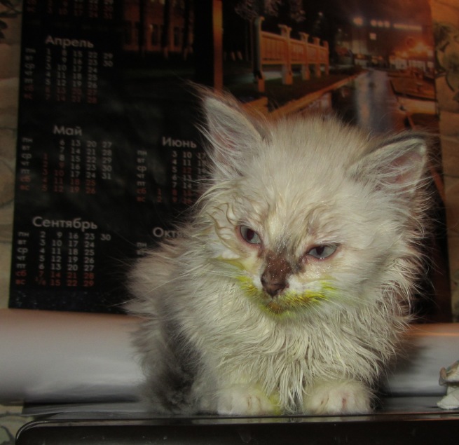 Мне кажется вся эта история с брошеными больными котятами не закончится для меня уже никогда. Как оказалась у меня эта малышка - через третьи руки я узнала ситуацию: девушка с молодым человеком купили на новогодние праздники на рынке девочку «невскую маскарадную», без документов (я лично думаю что это помесь) и как оказалось с целым букетом заболеваний. Как только прошла стадия умиления и начались проблемы со здоровьем ребята искали куда малышку сдать (но чтоб им отдали еще за нее деньги), предлагали знакомым со словами что у них нет времени ее лечить, а вы вылечите, будете потом котят за бешеные деньги продавать. Так как совсем недавно у меня был котенок с подобной историей, мои знакомые, которым сказали их знакомые, ее предложили купить мне. Я конечно отказалась но когда показали фото этого лысого, замусоленного, истощенного, измученного беспомощного комочка то не смогла пройти мимо и не помочь малышке, так как тянуть с лечением нельзя. Возраст малышки 2,5 мес, но выглядит и весит она как месячный котенок…один скелетик только..Видимо ее не кормили вообще… я думала - думала... и вот мы ее «выкупили» (Диме я сказала что котенок из подвала, просто ребята пригрели на денек чтоб я его забрала, не представляю его реакцию если б он узнал что я еще и деньги платила этим людям), привезли, ест еле-еле (бульон куриный), ротовая область поражена лишаем, уши тоже, пузико лысое, глаза в гною, чихает. Судя по воспаленной ротовой полости у малышки кальцивироз..очень зашуганая она.. Глазки я почистила ... капли-то уже отдала..завтра куплю все что нужно заново так как все лекарства раздала