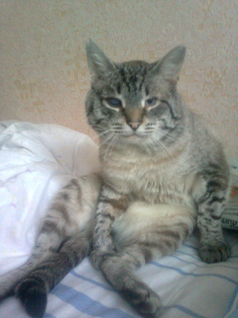 дрыхнет Вася постоянно на подушках,и хоть бы подумал что кто то ляжет,абсолютно без разницы,уляжется на середину и не сдвинешь,тяжёлый...любит подъедать за собакой,сидит около ждет пока тот поест,как только Ерёмка уходит,он сразу в миску лезет,притом она на высоком уровне