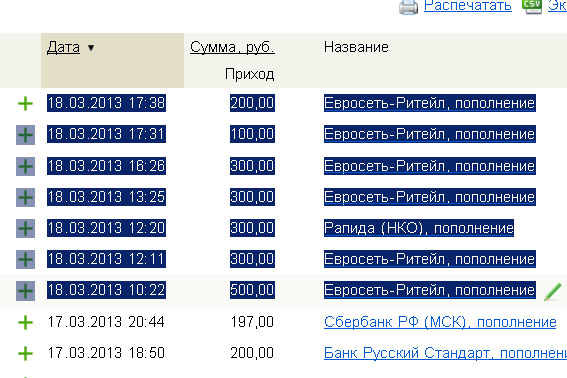 18.03.2013 13:25 300,00 Евросеть-Ритейл, пополнение
