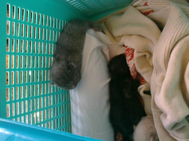 на помойке нашли живых новорожденных котят. Даша увезла их в валенту, там кормящая кошка есть