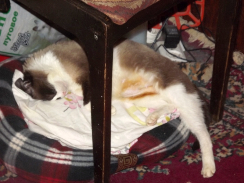 Я ее пока ждала, сварганила ей лежанку. Два дня пыталась ее туда класть (ну хочется же благородного лежания для фотосессии, а не под стулом или за шкафом). Она ее игнорировала. Тут мне пришло в голову положить в лежанку какую-нибудь тряпицу, вдруг, думаю, ей уюта не хватает. Положила старую наволочку, и Фифа тут же улеглась туда и спит теперь в основном там, даже ночью.