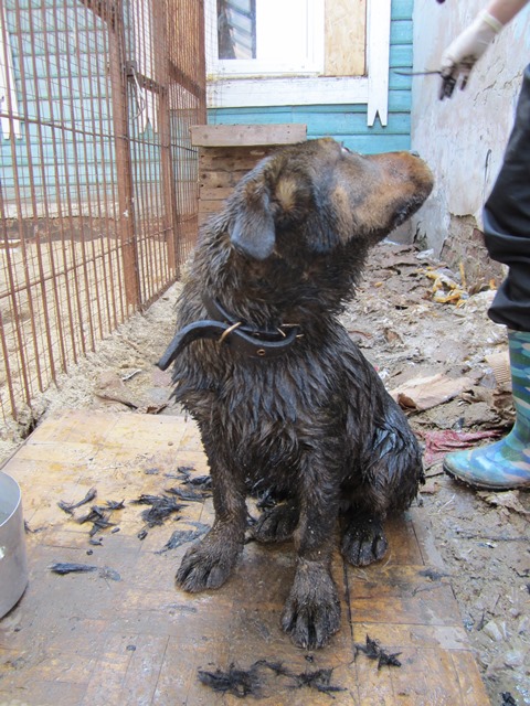 В Валенту привезли шенка ( какой-то мастиф, очень! похож на тибетского, возраст примерно 4.5 - 5 месяцев) с нефтебазы. История кошмарная. Подбросили к нефтебазе. Провалился в бак с нефтепродуктами ( видимо, мазут). Чуть не утонул. Еле вытащили. Попытались отмыть соляркой. Что-то смыли, не всё, в добавок к мазуту ещё и отравление. Шерсть вся пропитана этой дрянью. Холодно. Ядовито...