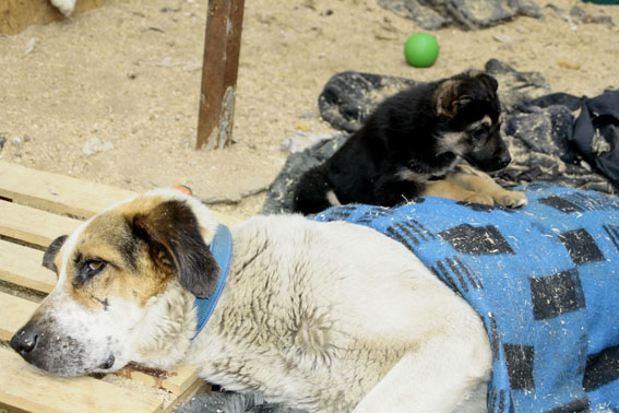 Пес постоянно дрожит, а щенок как бцдто егео старается согреть.