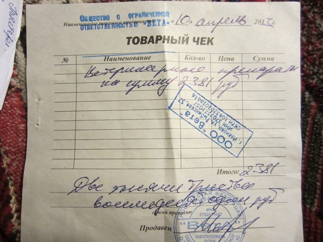 Чеки по последней поездке на химиотерапию в Иваново. + 1000 рублей бензин.