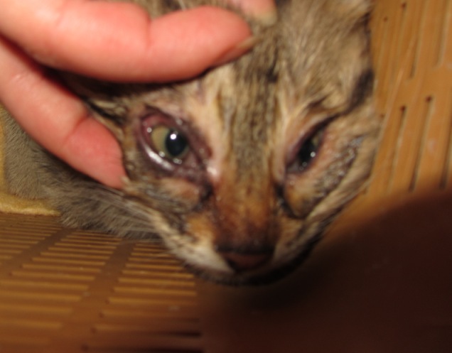 Распух левый глаз, из него течет гной , веки распухли (на втором фото немного видно)так же как в теме одноглазый котенок посреди проезжей части. Без лечения так же разрастется эта опухоль и будет нависать над глазом. Протерла заваркой, закапала левомицетин, надеюсь инфекция не разрастется так же как у Варежки. Лишай есть, проплешины над глазами, так же есть глисты.