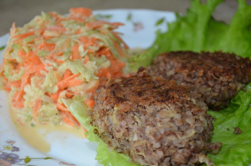 Сварить гречневую кашу: промыть гречку, залить водой и довести до кипения, после чего посолить, сделать самый маленький огонь и варить до готовности.Картофель очистить и натереть на средней терке (на крупной не стоит, так как может не прожариться).Отжать его руками от лишнего сока. Смешать кашу с натертым картофелем, добавить специи (я добавляю черный молотый перчик, сухой укроп и др.) и щепотку соли. Хорошо перемешать, лучше даже руками.Сформировать котлетки. Жарить в небольшом количестве растительного масла по 3-4 минуты с каждой стороны (под закрытой крышкой).