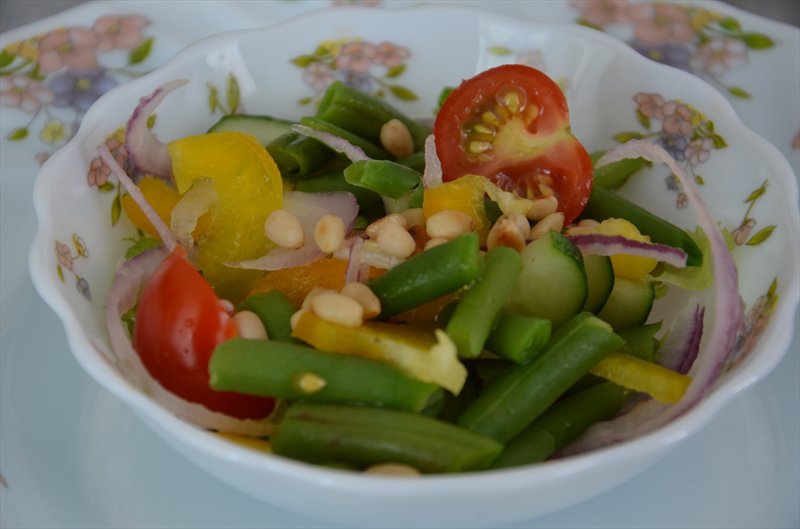 Фасоль отварить в подсоленой воде 6-8 мин., откинуть на дуршлаг и остудить. Листья салата порвать на кусочки, томаты черри разрезать пополам, луковицу порезать кольцами, огурец дольками, болгарский перец соломкой. Для заправки смешать оливковое масло, сироп, и сок лимона, соль и перец. Заправить салат соусом и украсить обжаренными кедровыми орешками.