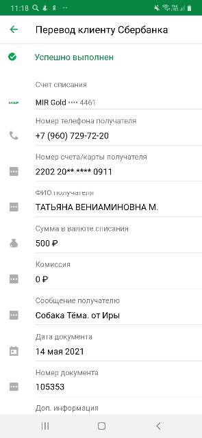 14.05.2021 год - 500 рублей (оплата передержки)