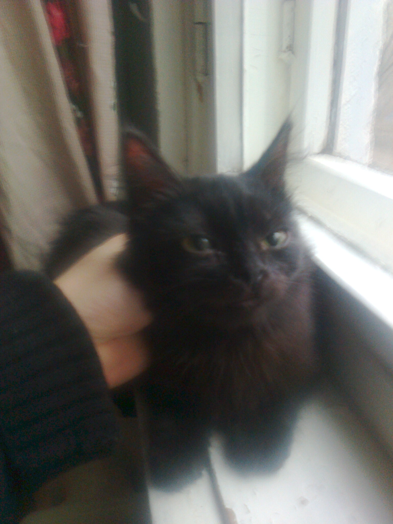 Итак, котёнок не тот, которого я подобрал. Этот постарше. Слава Богу! У того, слабого и больного, наверное, хозяева добрее. Но этого "чернушку", которого я нашёл сидящем на железной лестнице почти под потолком (у чердачного входа), опознала пожилая женщина - мать тех, кто котёнка выкинул. Значит, всё-таки в точку.