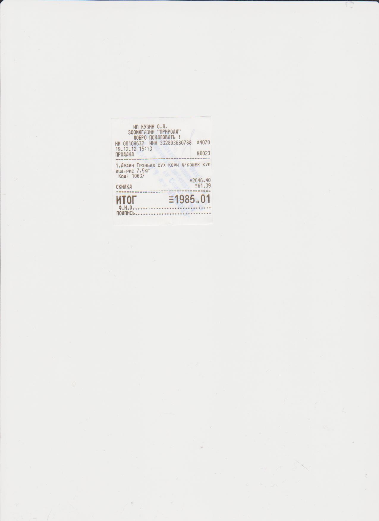 Выставляю чек за корм, который вчера привезла (7,5 кг)