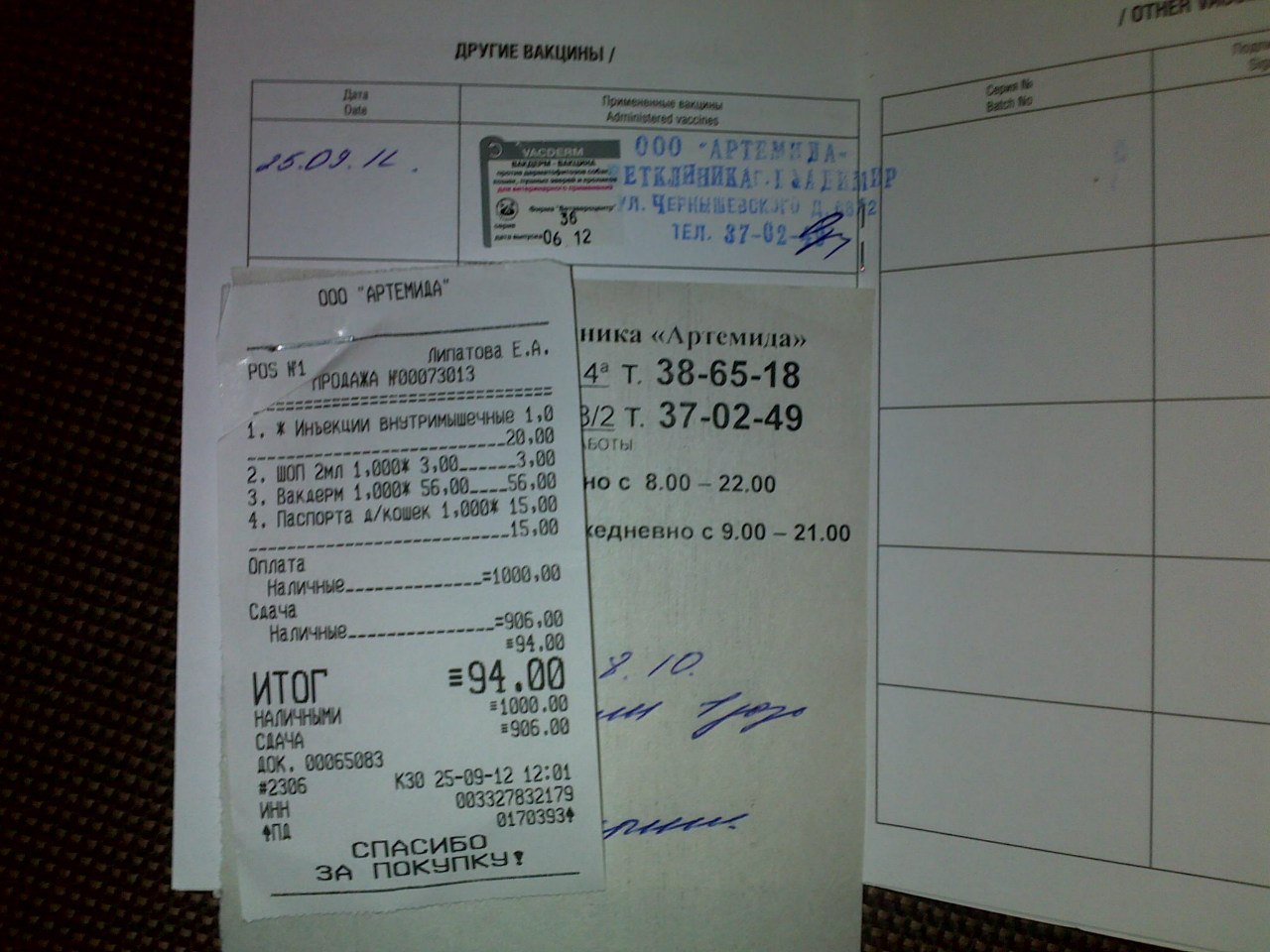 25.09.12 - 94 руб. - инъекция Вакдерм первичная котенку, который находился на пристройстве (з мес)