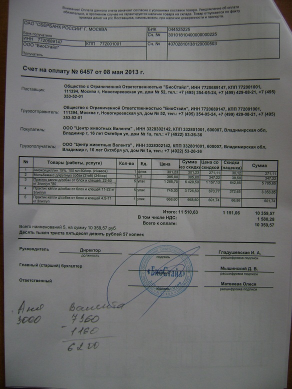 За Практик, покупала упаковку, в ней 3 пипетки ( 1 пипетка на 4 недели)на двоих с Великом, тема viewtopic.php?f=72&t=6245&start=70 Общая стоимость упаковки 1157,13р. В накладной подчеркнуто карандашом. Одну пипетку делим на 3 части - одну часть Деле, две Велику. За Делю - 385,71р.