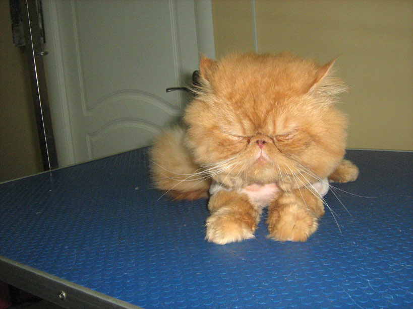 Кот - молодец! Весь верх и бока он дал постричь, не выпуская когти и не думая укусить, терпение лопнуло, когда мы дошли до нижней части. Тут мы заистерили так, что я поняла, что без наркоза не обойтись (но не хотелось его делать, так как понятно, что кот по сути то добрый, но держать было некому, и кушал он утром - не есть хорошо на наркоз).. И он как услышал мои мысли.., вдруг повёл себя не как кошка и тем более своенравный перс, а как обычно поступают собаки - пережив истерику, вдруг устал и начал слушаться - так мы по-тихонечку и всю нижнюю и заднюю часть побрили одни! НО это ужасно, я никогда не стригла персов, у которых этот один большой колтун уже настолько плотный к коже, что кот сам счёсывал шерсть и выдерал.., стригли совсем по чуть-чуть, очень медленно, и у меня даже нулевой нож еле-еле проходил между шерстью и кожей.., хорошо, триммер спас. Но всё равно в итоге все пацарапанные - где он себя когтями (причём не только на спине он выдрал, а ещё за ушами, шею, бёдра - как же ему колтуны мешали), где машинкой, где я его держала собачьей хваткой. Когда стригла когти, оказалось, что они короткие - их стригли около месяца назад.