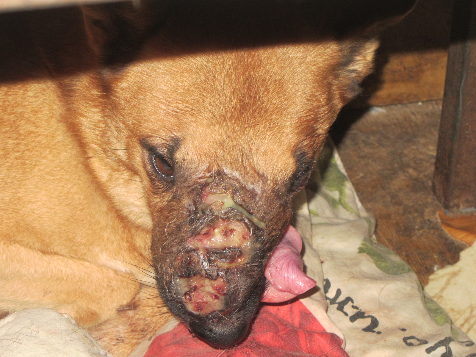 Прошлым летом с ней приключилась беда - в простой собачей перепалке за кость ( и дракой-то назвать нельзя, так, поцапались немножко)))) ) беднягу укусили за нос. Попала инфекция, началось воспаление. Дальше-больше... Разнесло всю морду. И вот тут сказались и месяцы скитаний, и голодуха, и пережитый холод. Иммунитет никак не может перебороть болезнь. Да она живёт. Она терпелива. Она ест через силу и даже пытается вилять хвостом. Но гной сочится из носа и по глазам, а морда вся покрыта незаживающими язвами.